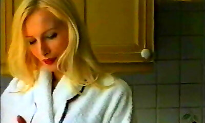 Retro blonde babe in spandex costume gets drilled on the couch