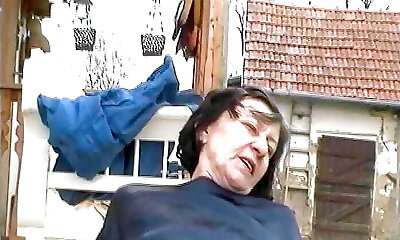 A super busty German black-haired gets her muff hammered outdoors